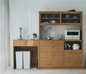 L字型キッチンの脇にはカップボード用のスペースを確保。調理器具の収納だけでなく、お気に入りのインテリアを飾ったりすることも。