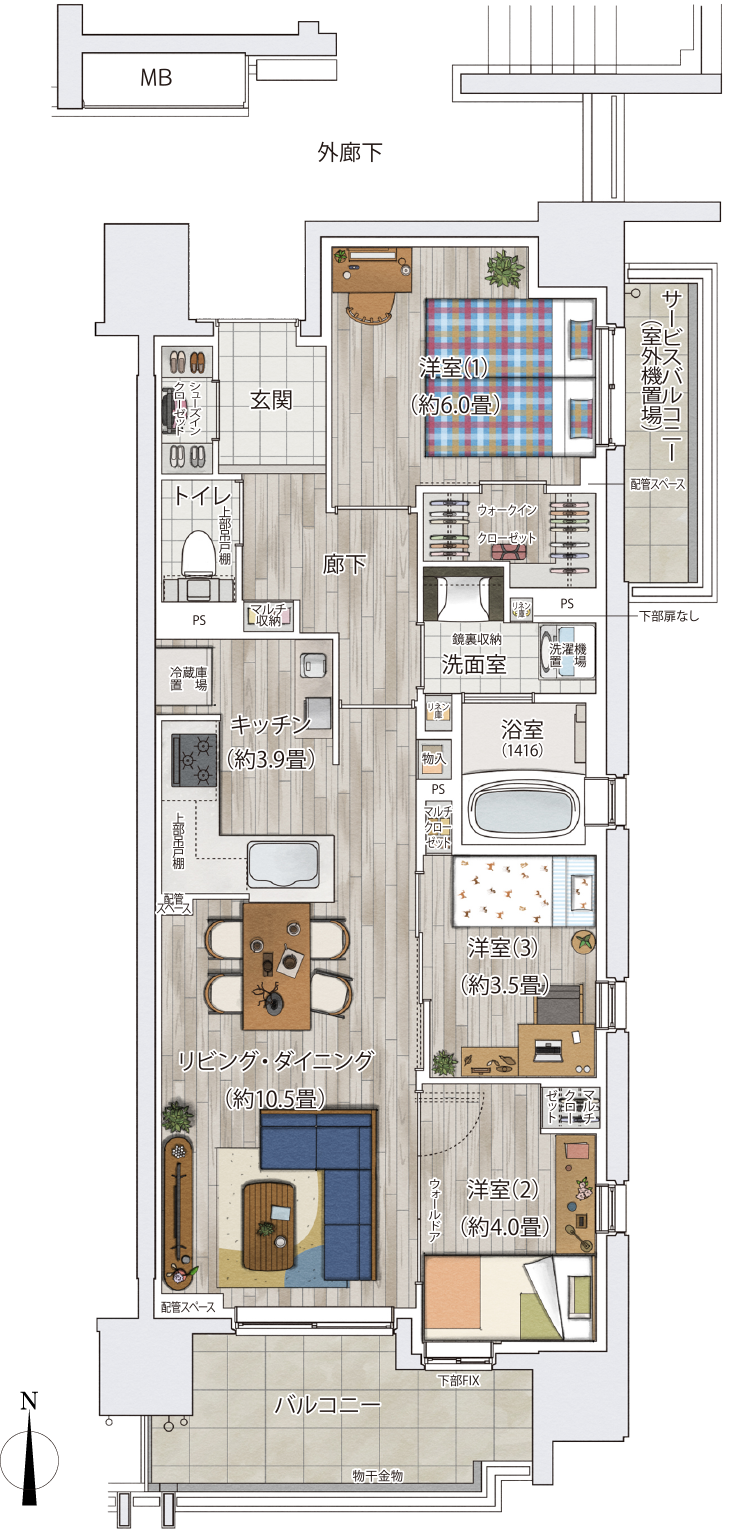 ● 洋室(1)は夫婦の寝室として利用。サービスバルコニーの開放感とWICの収納力が魅力の快適な空間に。