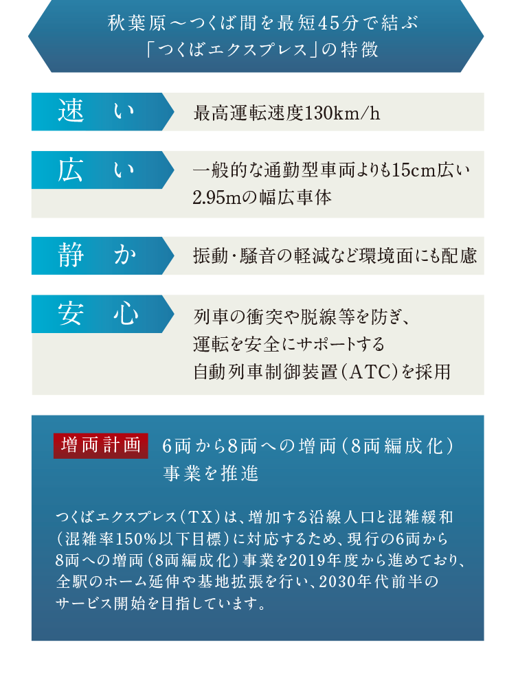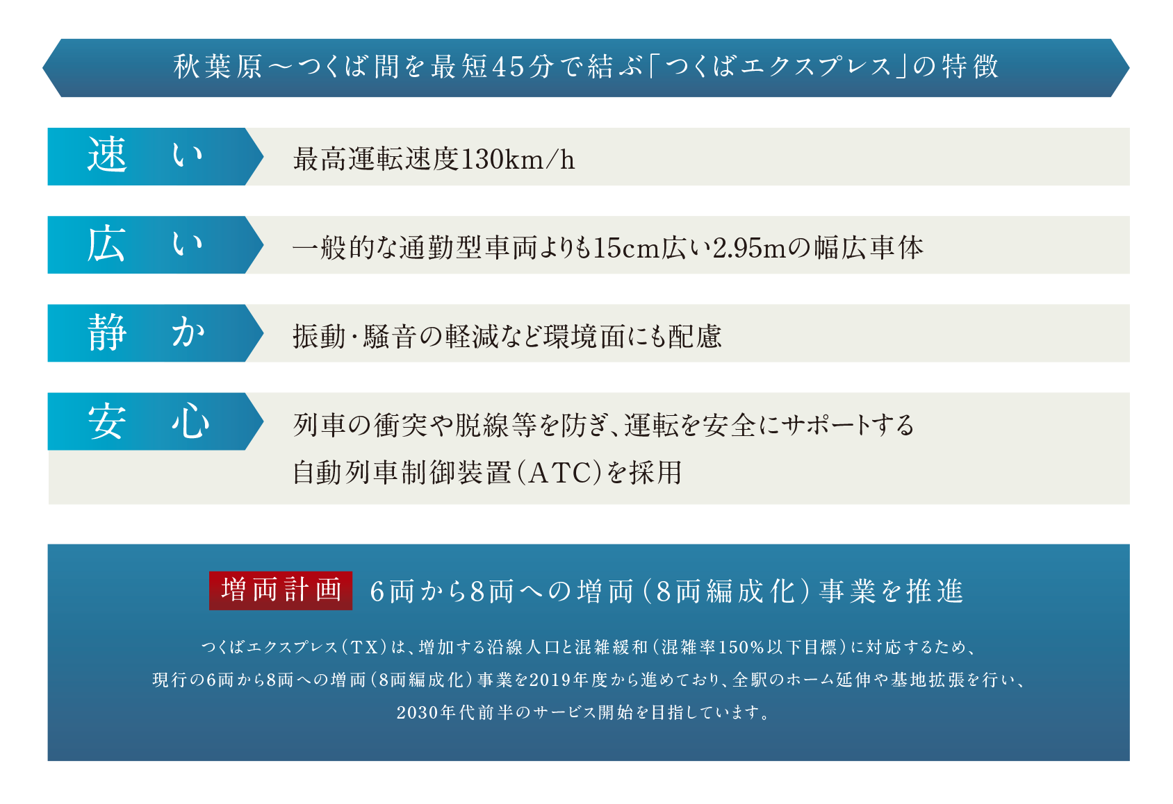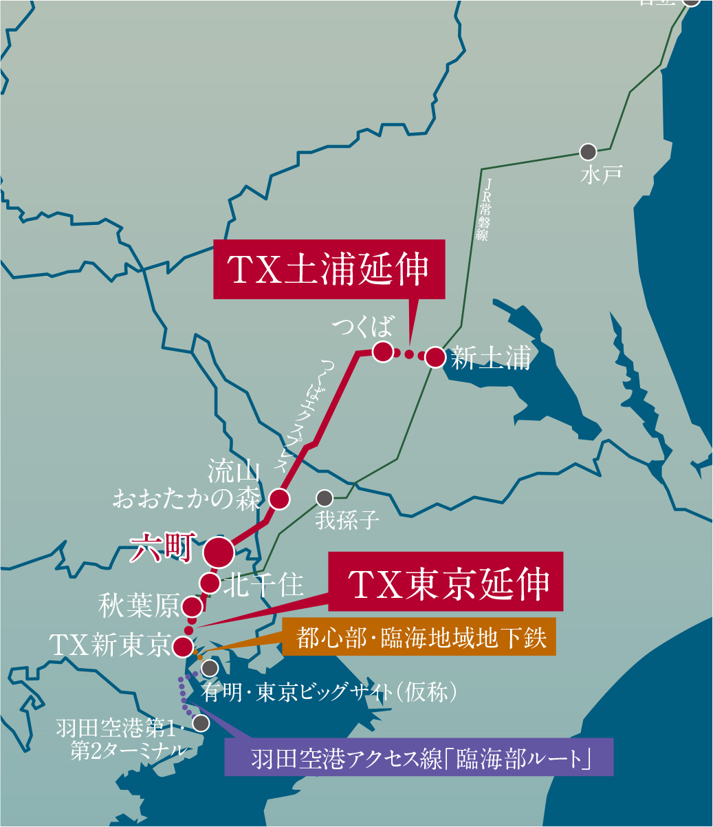 つくばエクスプレスは、北部の「土浦方面」と南部の「東京駅方面」の2つの軸で延伸が計画されており、JR常磐線(土浦)との直結による移動短縮と、都心・臨海部へのアクセス改善によるネットワーク強化、それに伴う利便性向上や経済発展、災害時の代替ルートを確保するために計画されています。