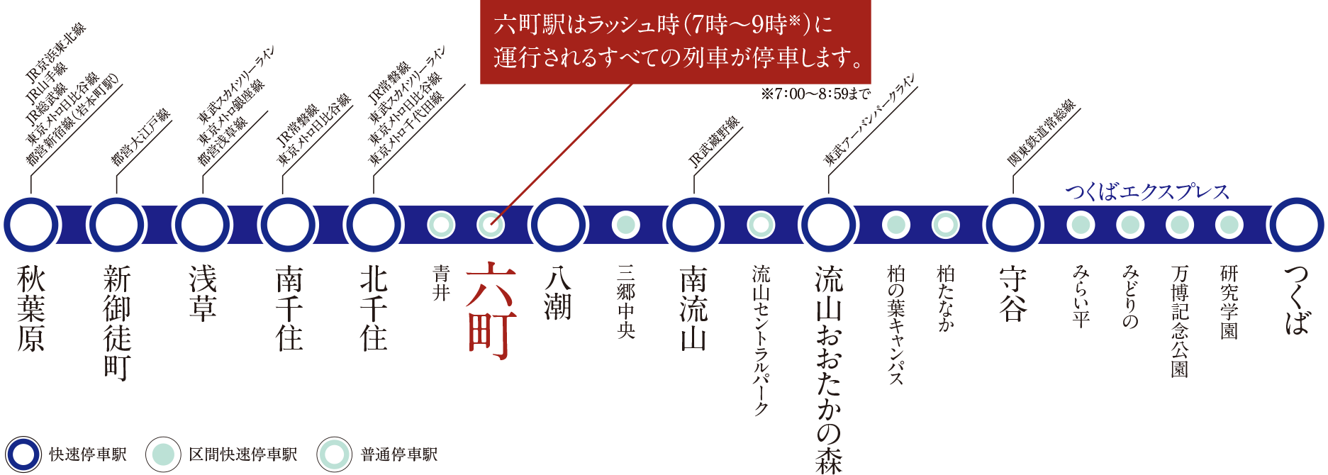 つくばエクスプレス、東京メトロ日比谷線・千代田線、JR常磐線、東武スカイツリーラインの5路線が走る、