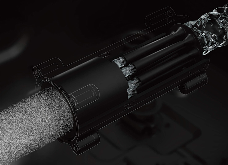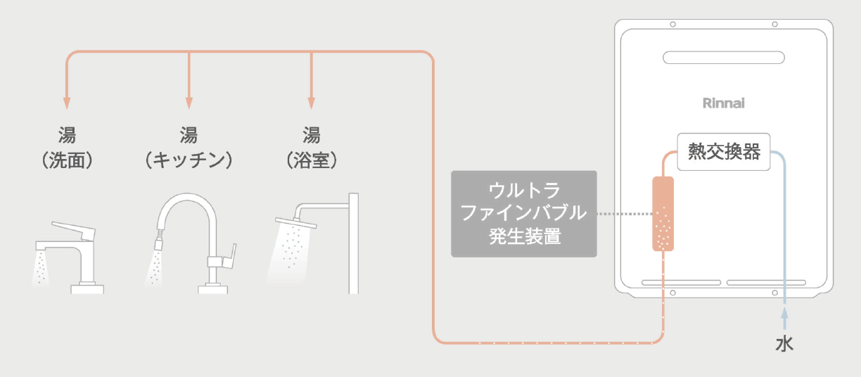 お湯の水圧を変化させて水中の空気を気泡化し、さらに気泡をせん断して細かくすることでウルトラファインバブルを発生させます。ウルトラファインバブルは、数週間から数ヶ月も水中に残る特性があります。浴室はもちろん、洗面所やキッチンなどへ、給湯器からウルトラファインバブル入りのお湯を送ります。