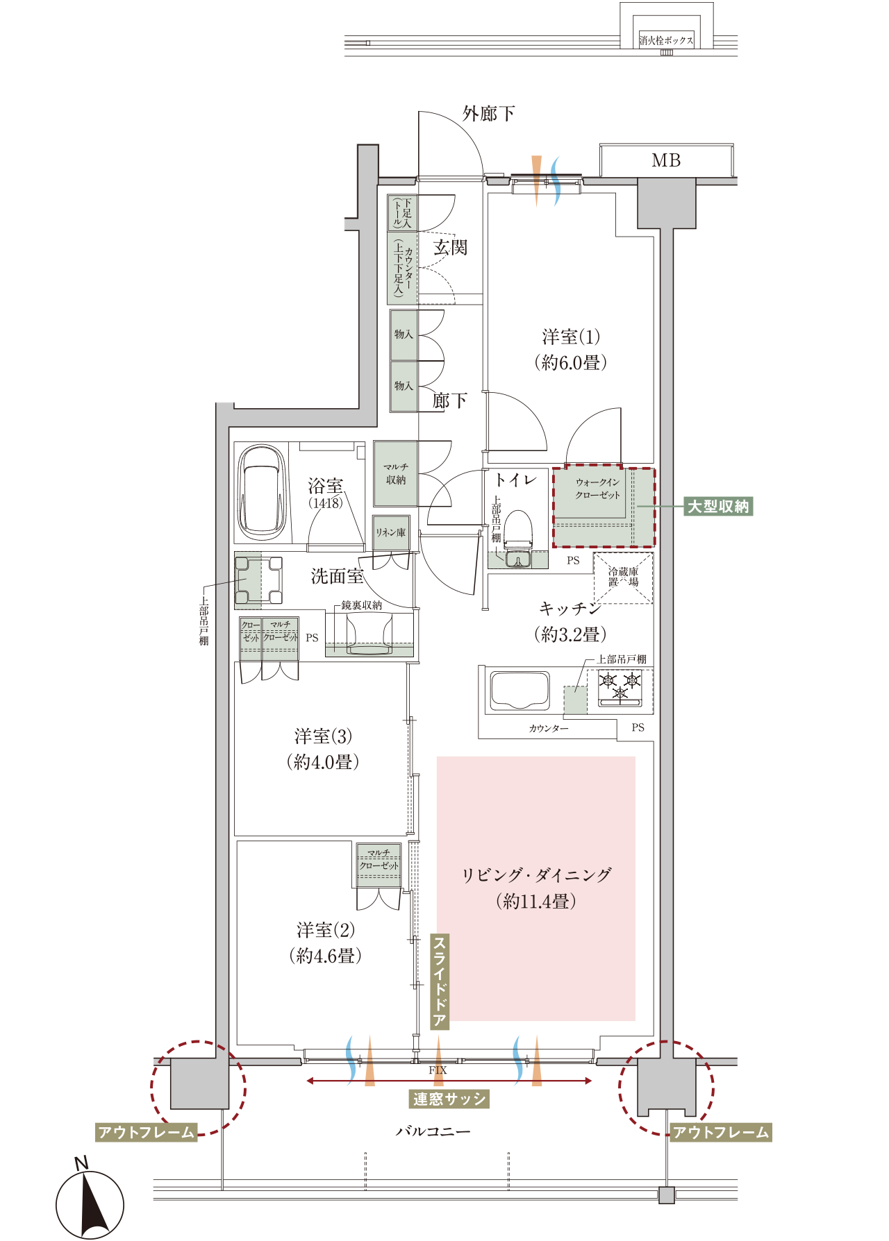 リビング・ダイニングから2つの居室へ出入りが可能な南向き67㎡3LDK住戸。